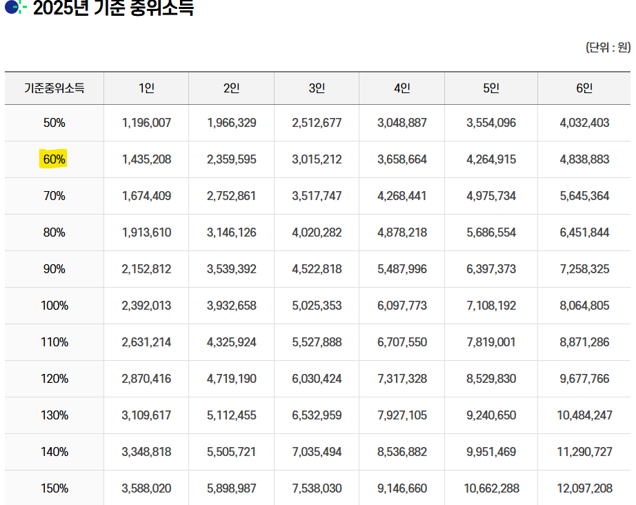 - 만 19세 이상 성인 중 기준 중위소득 65% 이하인 가구